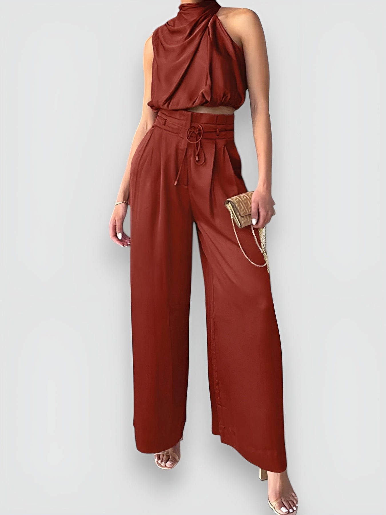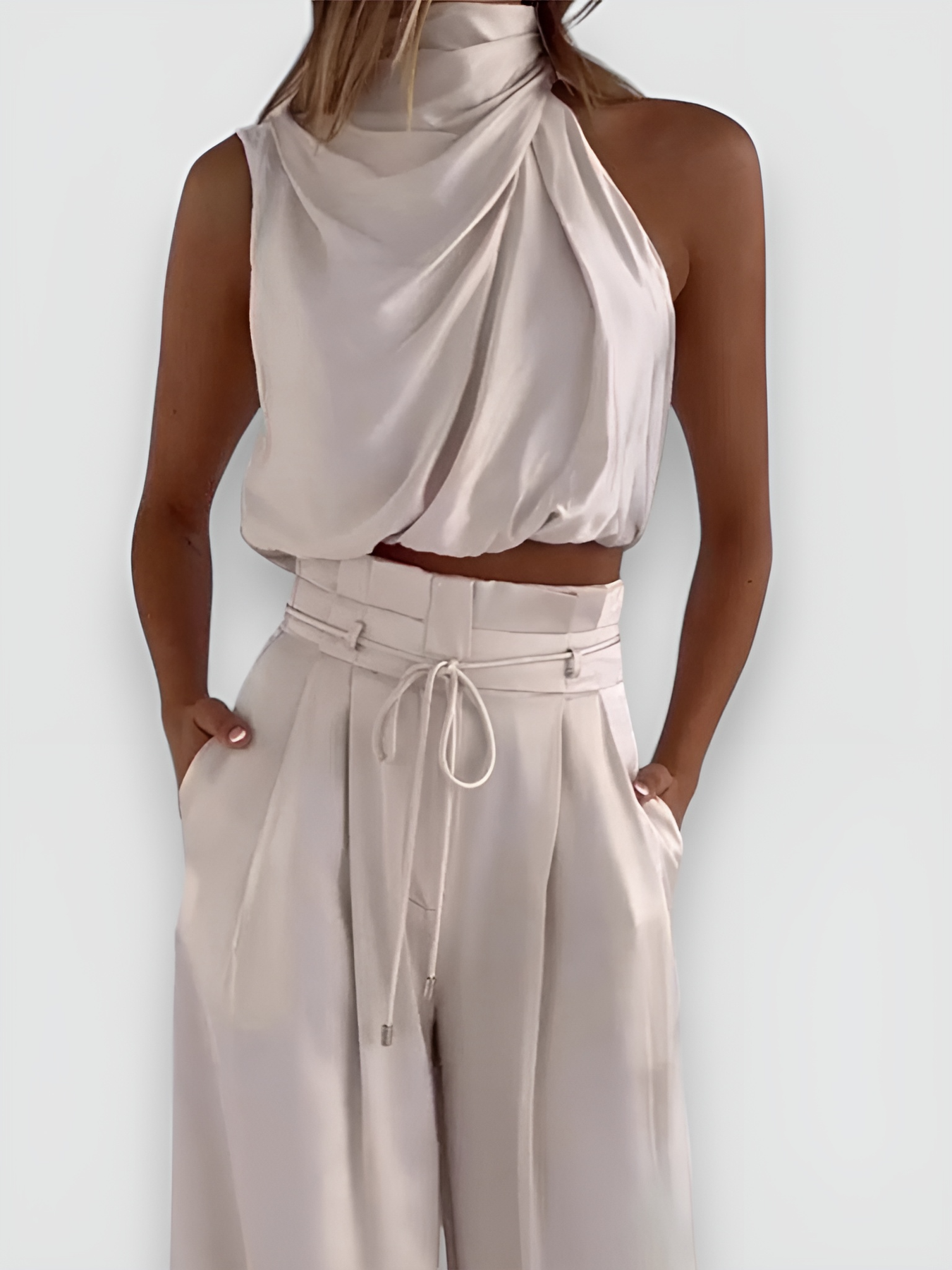 Questo elegante set è composto da un top senza maniche e pantaloni a gamba larga. perfetto per un look estivo sofisticato.